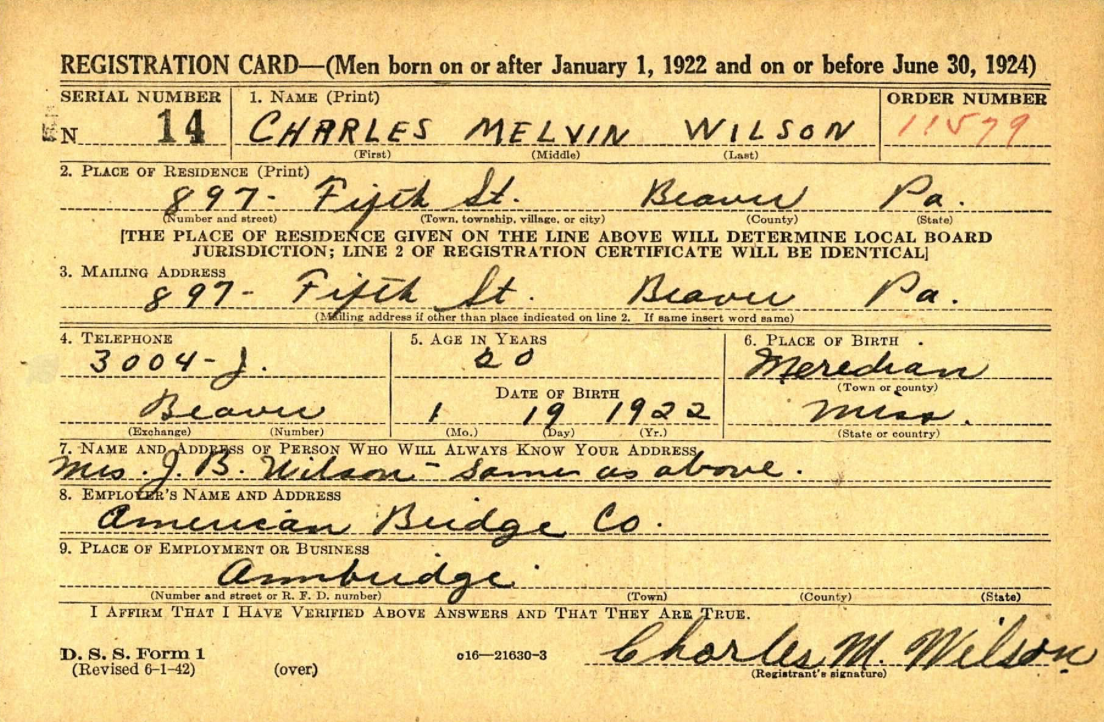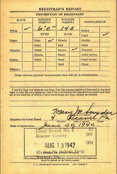 Six months after Pearl Harbor, Chuckie was 20 years old when he registered for the draft as required under the 1940 Selective Training and Service Act. Between 1941 and 1943, there were five draft registrations for WWII as the ages changed to 18-44. I found his draft card on the National Archies. It is the only known record of Chuckie’s signature. He’s listed as being 6 Feet tall and 145 lbs. which sounds about right for an active, healthy 20 year old.