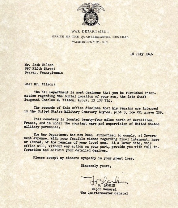 The War Department is most desirous that you be furnished information regarding the burial location of your son, the late Staff Sergeant Charles. M. Wilson, A.S.N. 13 108 714.