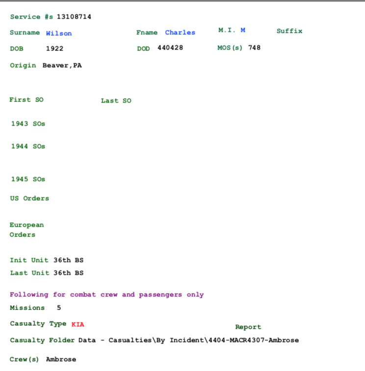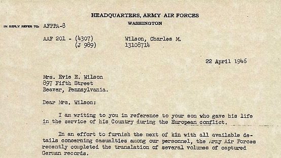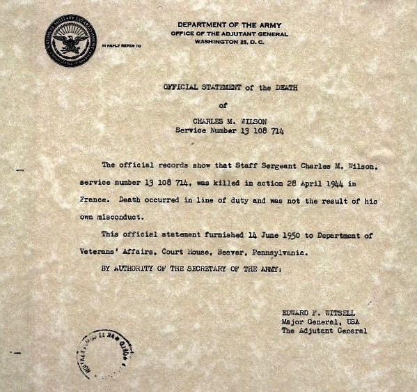 World War II was the deadliest military conflict in history. An estimated total of 70โ85 million people perished, which was about 3% of the 1940 world population (est. 2.3 billion). Chuckie was one of the 52,173 U.S. Army Air Force killed in action. On 14 June 1950 an official Statement of Death was furnished by the Department of the Army to the Department of Veteran’s Affairs, Court House, Beaver, Pennsylvania noting Charles M. Wilson was killed in action on 28 April 1944 in the line of duty in France.