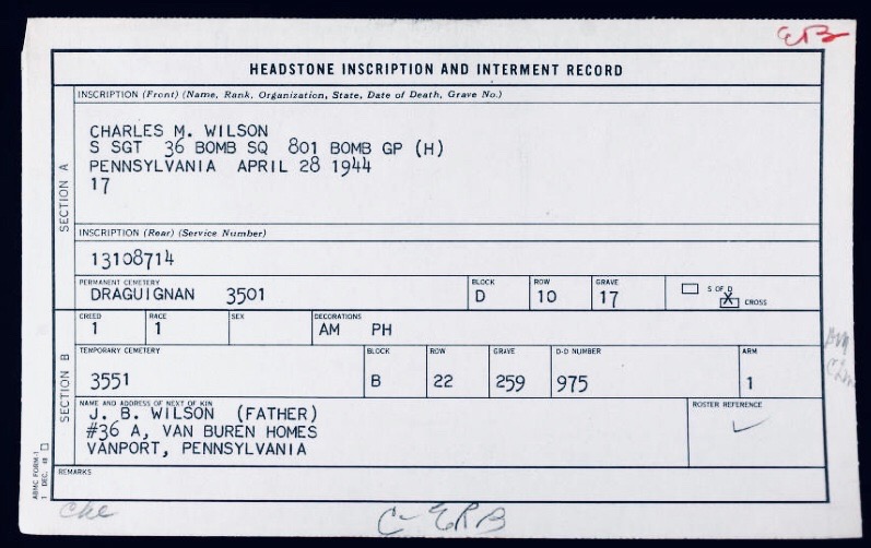“In regard to Staff Sergeant Charles M, Wilson, these records indicate that he was killed 28 April 1944 , when his B-24 (Liberator) bomber crash landed at Sr. Cry de Valorges, near Lyon, France. These records further state that his body was interred in the new cemetery of Lyon, row #3, grave #1. The Quartermaster General, in his capacity as Chief, American Grave Registration Service, is charged with the responsibility of notifying the legal next of kin concerning grave locations of members of the military forces who are killed or die outside the continental limits of the United States. If the report of your son’s burial has not been confirmed and you have not been notified by the quartermaster General, that official will furnish you definite information immediately upon receipt of the official report of interment from the Commanding General to the theater concerned. May the knowledge of your son’s valuable contribution to our cause sustain you in your bereavement. Very sincerely,“