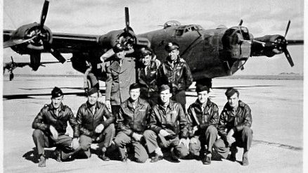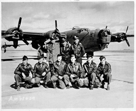 The Ambrose Crew in front of B-24 Liberator The Worry Bird. Charles M. Wilson is 4th from left, front row kneeling.