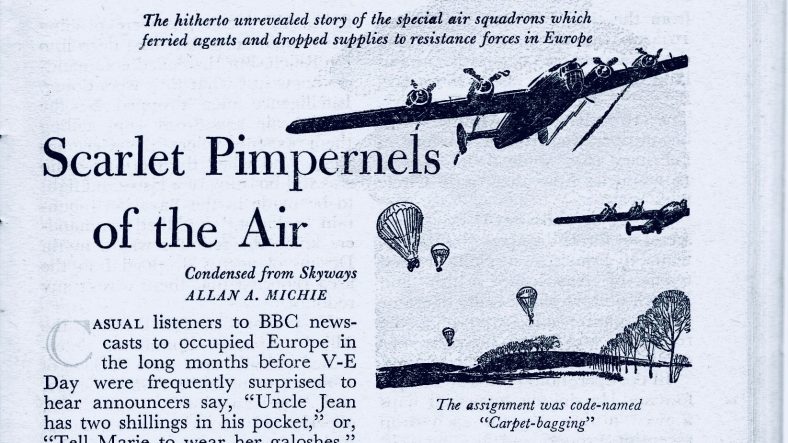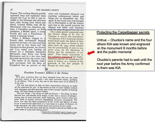 While the secrets of the Carpetbagger Project were closely guarded for fifty years, the American publication Readers Digest was the first to publish “the hitherto unrevealed story of the special air squadrons which ferried agents and dropped supplies to resistance forces in Europe.” I found a reference to the article in the Worry Bird Missing Air Craft Report – so I went on Ebay and quickly and easily bought an actual copy of the November 1945 issue. Chuckie is referenced at the end of the article but, unsurprisingly, not by name nor did the article reveal the full truth about him or his fellow airmen despite all the complete facts well known to many and none made known to his parents yet.