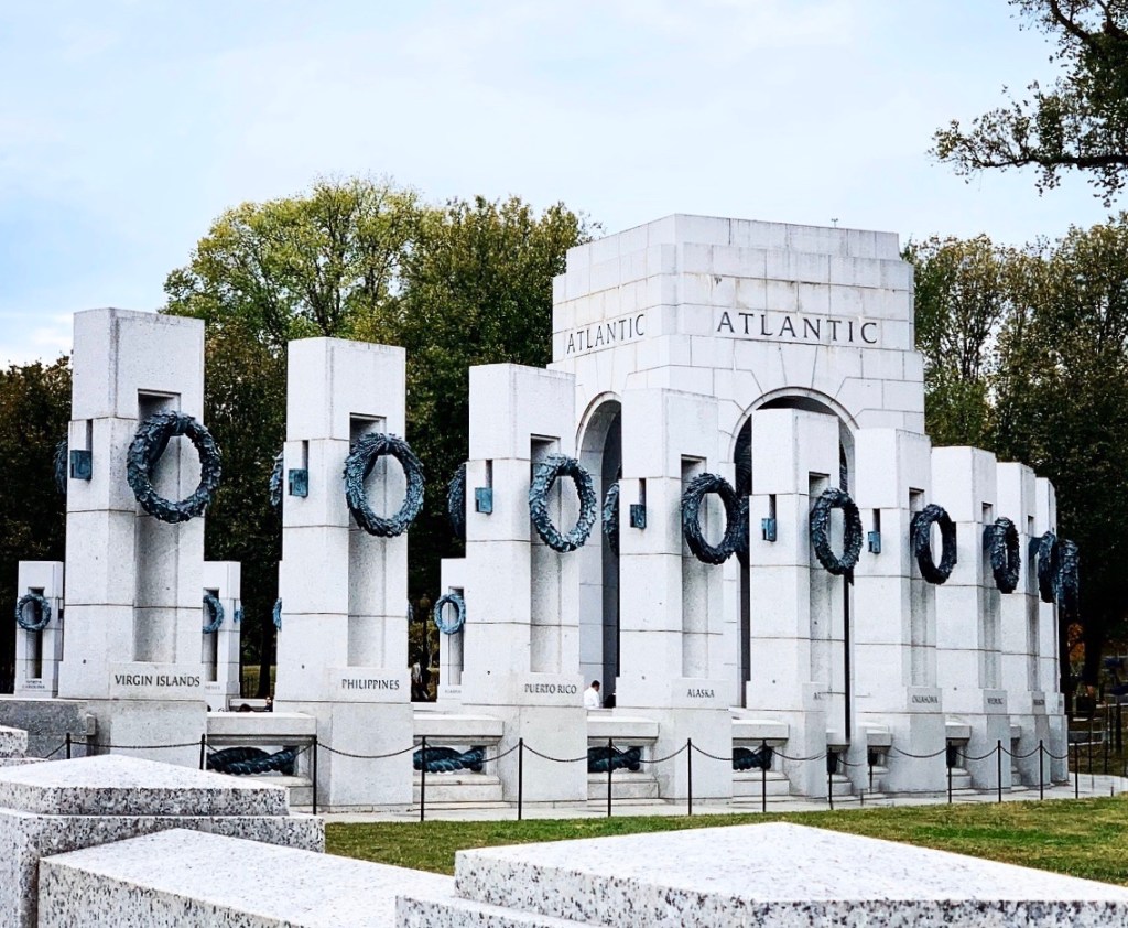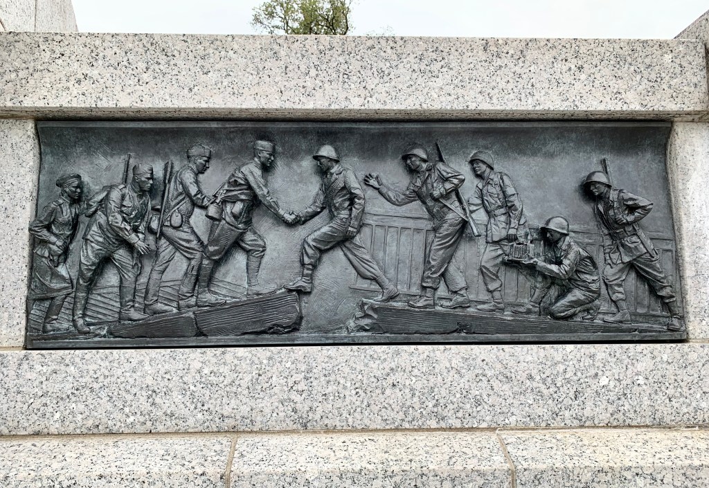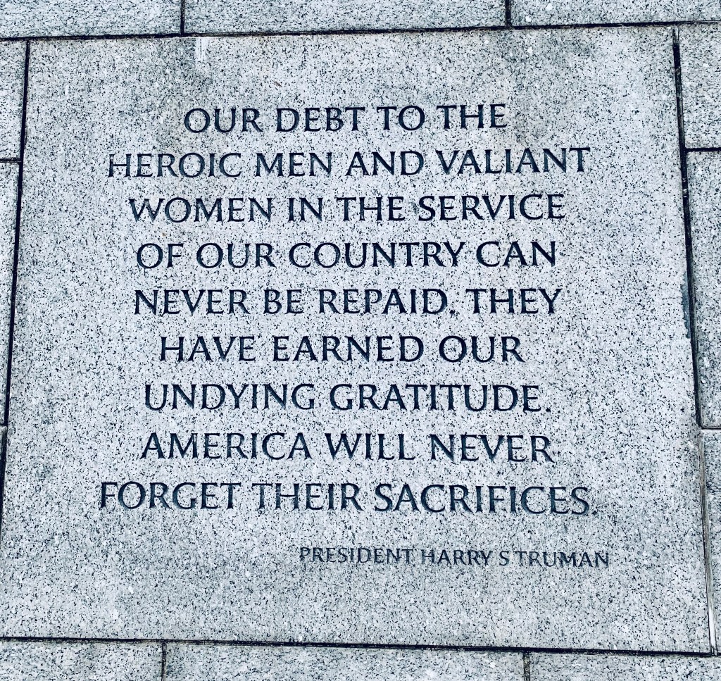 This weekend we visited the World War II Memorial in Washington DC that honors the 16 million who served in the armed forces of the U.S., the more than 400,000 like US Army Staff Sergeant Charles โChuckieโ Melvin Wilson, 36thBomb Squad, 801stBomb Group who died, and all who supported the war effort from home. Stone architecture, bronze sculptures, and a glorious fountain combine to recognize the many ways Americans served in the fight to end tyranny and restore freedom around the globe.