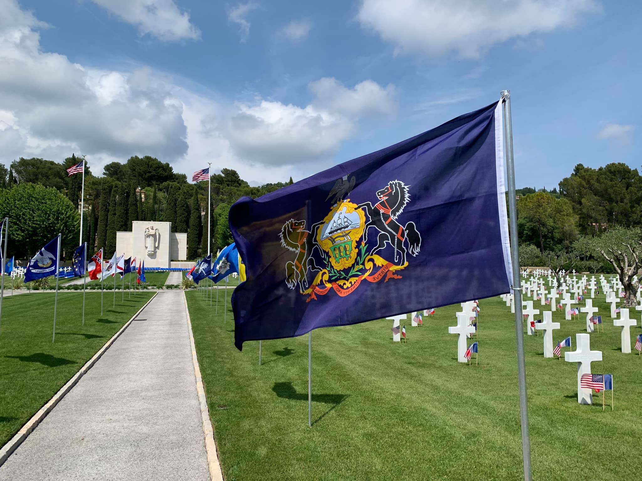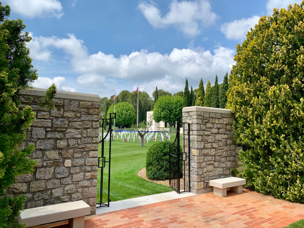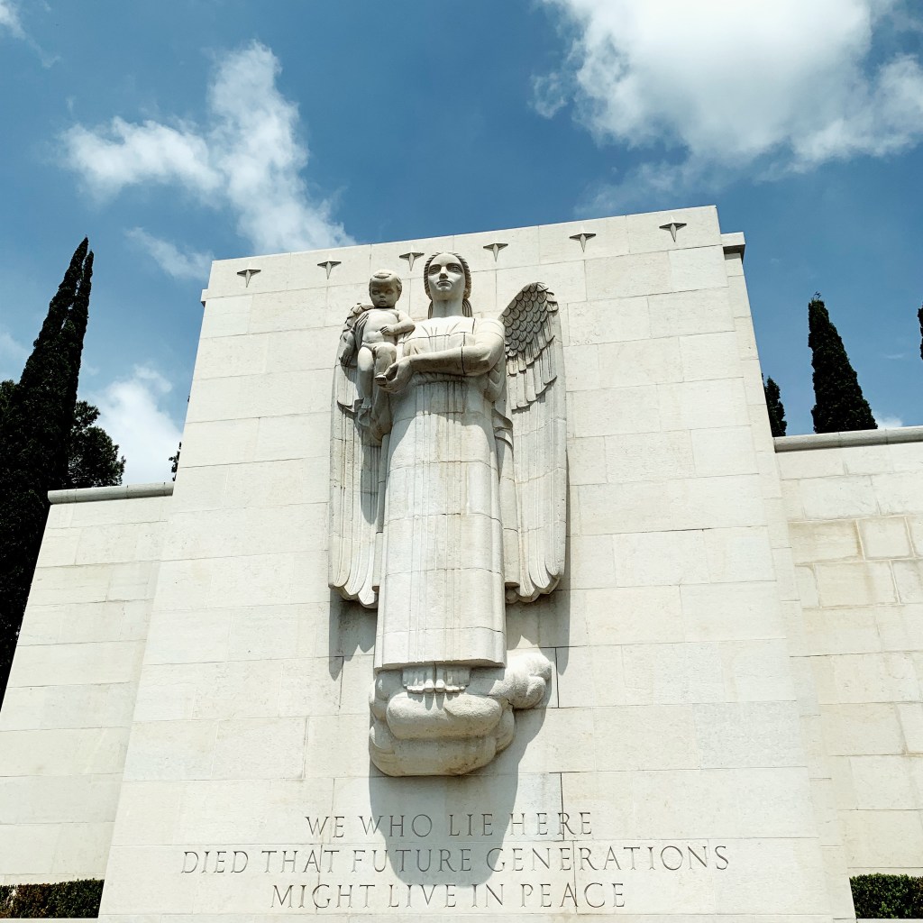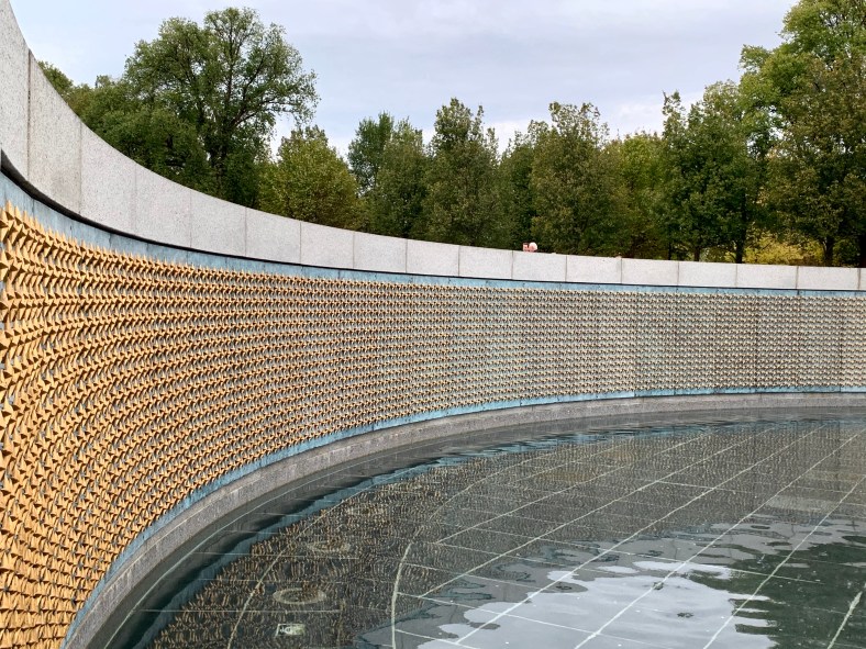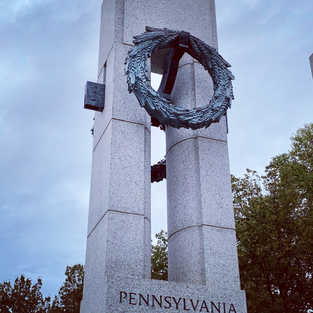 Especially moving to see were 56 triumphal columns surrounding the fountain that list U.S. states, commonwealths, and territories that sent men and women to serve under the U.S. flag during WWII. Chuckie was from Pennsylvania. Each column has two wreaths, one inside and one outside. One wreath consists of oak leaves, representing industrial might. The other consists of wheat, representing the agricultural might of the United States.